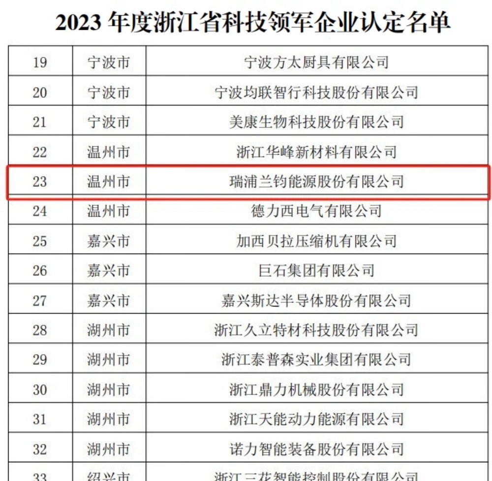 11月3日,瑞浦兰钧被浙江省科技厅认定为2023年度浙江省科技领军企业,标志着瑞浦兰钧进一步强化企业科技创新主体地位,成为创新能力卓越的科技型骨干企业。